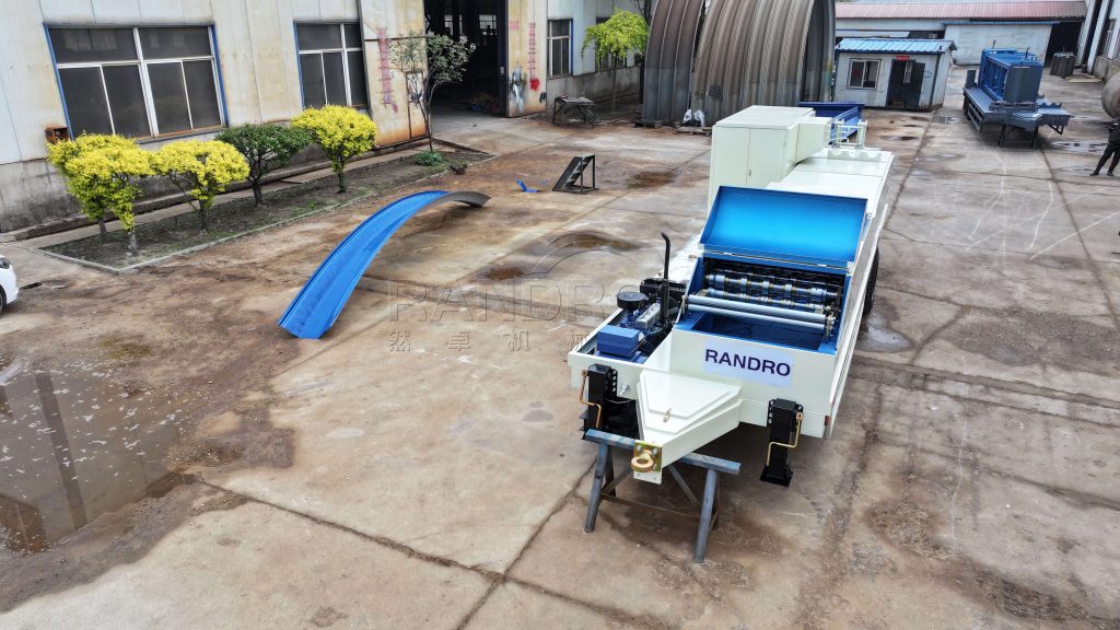 K-Span machine typically use diesel engine as a power source. An electric motor drives rollers to progressively roll-form materials such as color steel plates into shape. During the rolling process, the plates are bent and shaped according to a preset arc and shape to form the arched plate required for the beamless arch structure. Randro Machinery’s mobile beamless arch forming equipment is equipped with an advanced and reliable PLC control system, which can precisely control parameters such as rolling speed, force, and arc to ensure the forming quality of the arch plate. Randro Machinery is a Chinese manufacturer of roll forming machines. Our beamless arch forming equipment is the best-selling K-Span machine in the Philippines, our K-Span is also the best-selling k-span in Zambia. Randro Machinery is also the best-selling roll forming machine supplier in Africa.