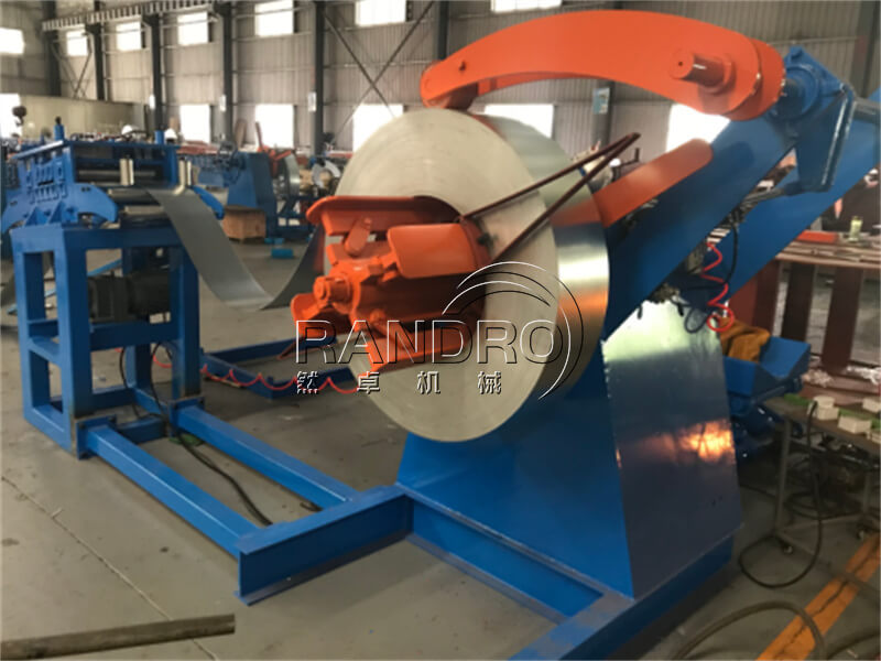 The image below shows a 5Tx500mm Hydraulic uncoiler, an automatic feeding and leveling machine, and a manual take-up stand. The uncoiler can handle coils weighing up to 5 tons and features hydraulic control for unwinding. The material is then straightened by the automatic feeding machine, allowing for better punching and processing by the press.