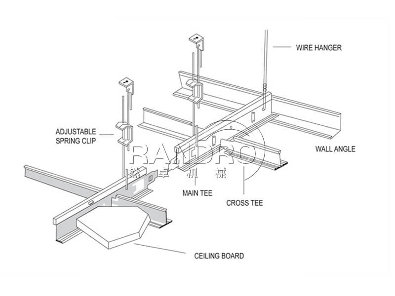 T grid ceiling, also known as a suspended ceiling or drop ceiling, is a secondary ceiling system hung below the main structural ceiling. which supports lightweight ceiling tiles or panels. Suspended ceiling T grid system is composed of main T, cross T, wall angles keel, and ceiling tiles. These components work together to form the suspended grid. Suspended T bar Main Tee Cross Tee Roll Forming Machine is the machine which products T bar keel.