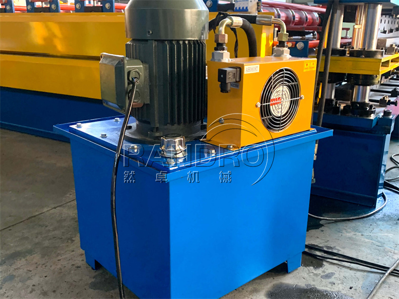 As shown in the figure below, the TR4+TR5 roof panel roll forming machine is made of high-quality raw materials, with a sturdy and durable 300H steel frame structure, 45# steel chrome-plated and quenched rollers, CR12mov shear blades, and a hydraulic pump station with air cooling, etc., to ensure that the machine can be used for a long time and to guarantee the quality of the roof panel roll forming machine.